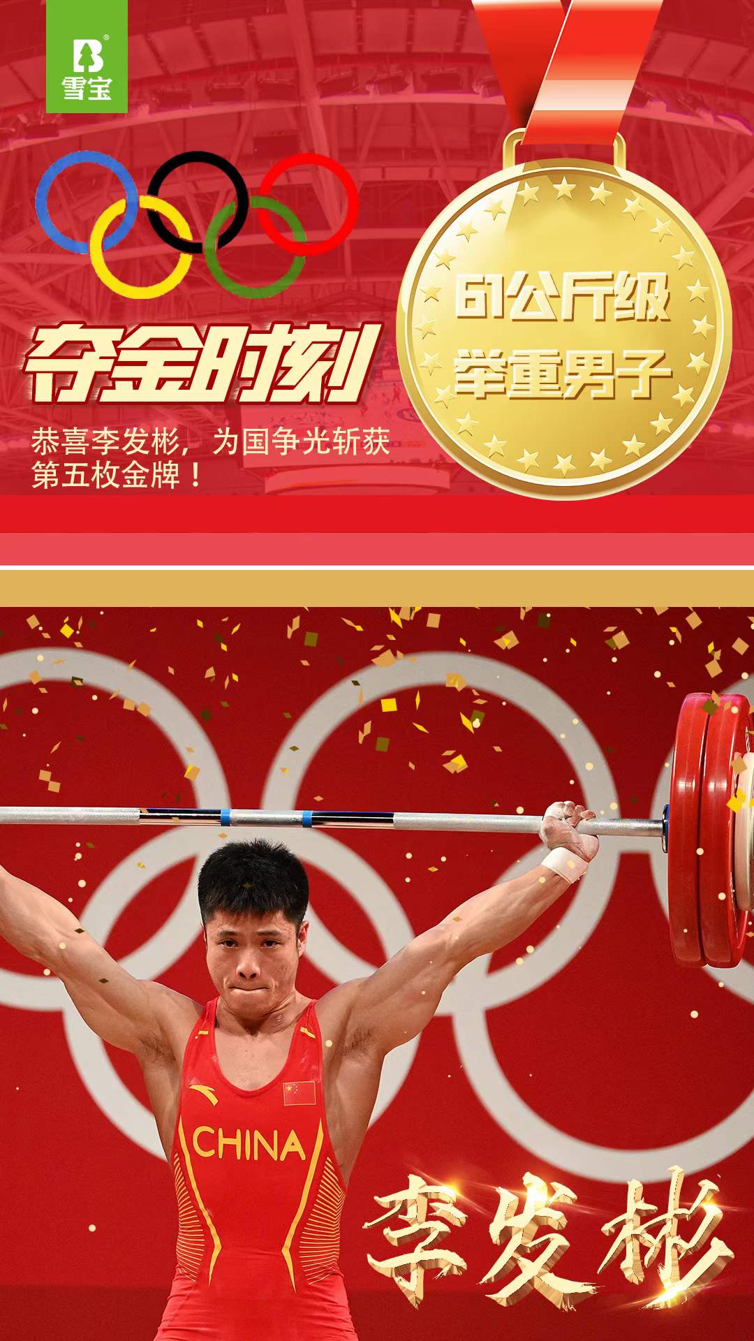 - 雪寶板材恭喜李發彬在2020奧運會男子舉重61公斤級獲得冠軍