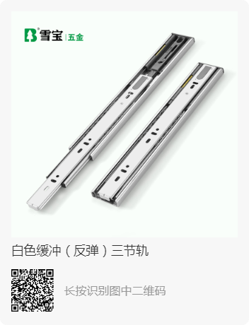 雪寶4515白色緩沖(反彈)三節軌:靜默守護溫柔時光 滑軌抽屜在現代家具中是必不可少的組成部分,而在整個抽屜的設計中,小小的滑軌對整個抽屜的質量可有著舉足輕重的影響,那些大大小小的抽屜能否自由順滑地推拉、承重如何,全靠滑軌的支撐。雪寶4515緩沖(...