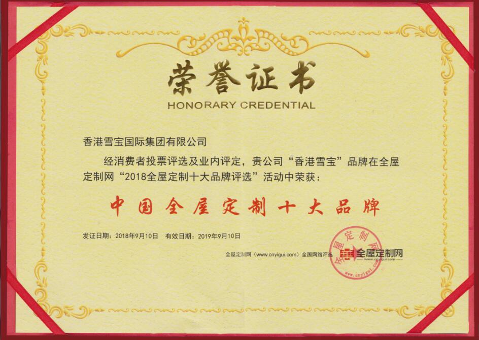 板材十大名牌雪寶定制榮獲“2018中國(guó)全屋定制十大品牌”
