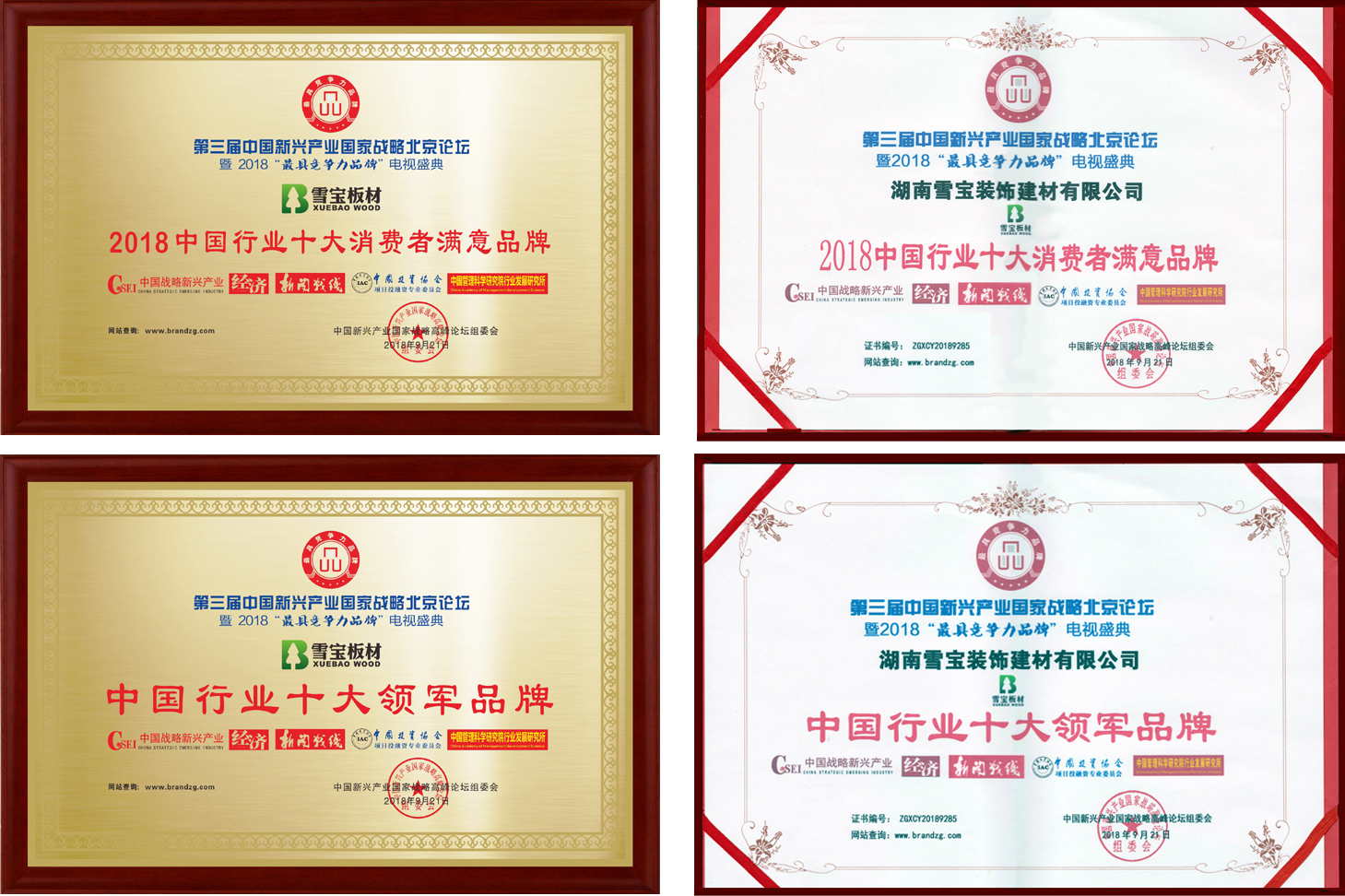 鑒于雪寶的行業影響力,2018年9月20日至22日期間,兒童房健康板雪寶板材受邀出席毗鄰北京釣魚臺國賓館的中國科技會堂舉行的第三屆中國新興產業國家戰略北京論壇暨2018“最具競爭力品牌”電視盛典,并榮獲“中國行業十大領軍品牌”、“2018中國行業十大消費者滿意品牌”兩項大獎!受到了評委會、全國新興產業權威專家和主流媒體的極大肯定!