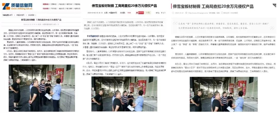 經核實,“雪寶小王子”、“楿港雪寶”、“雪寶木精靈”等板材不但在名稱和商標上抄襲雪寶品牌,而且在原材料、膠水、甲醛含量等多項核心指標上都與正規雪寶品牌所售板材相距甚遠,極大影響了雪寶品牌的聲譽,損害了消費者的利益,雪寶公司請求工商部門查處。