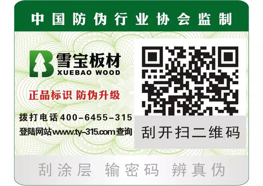 雪寶板材上每張板上均有貼防偽標,可以刮開涂層查真偽,刮開后背面會出現16位編碼數字。此編碼為全國唯一編碼,即每件產品的編碼在全國范圍內無重復。而且標識上有提示兩種查詢方式:一為電話查詢,二為網站查詢。