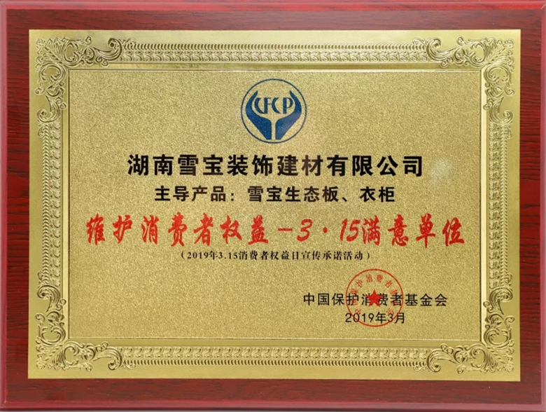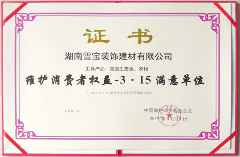 生態(tài)板十大名牌雪寶榮獲2019維護(hù)消費(fèi)者權(quán)益-3.15滿意品牌稱號(hào)