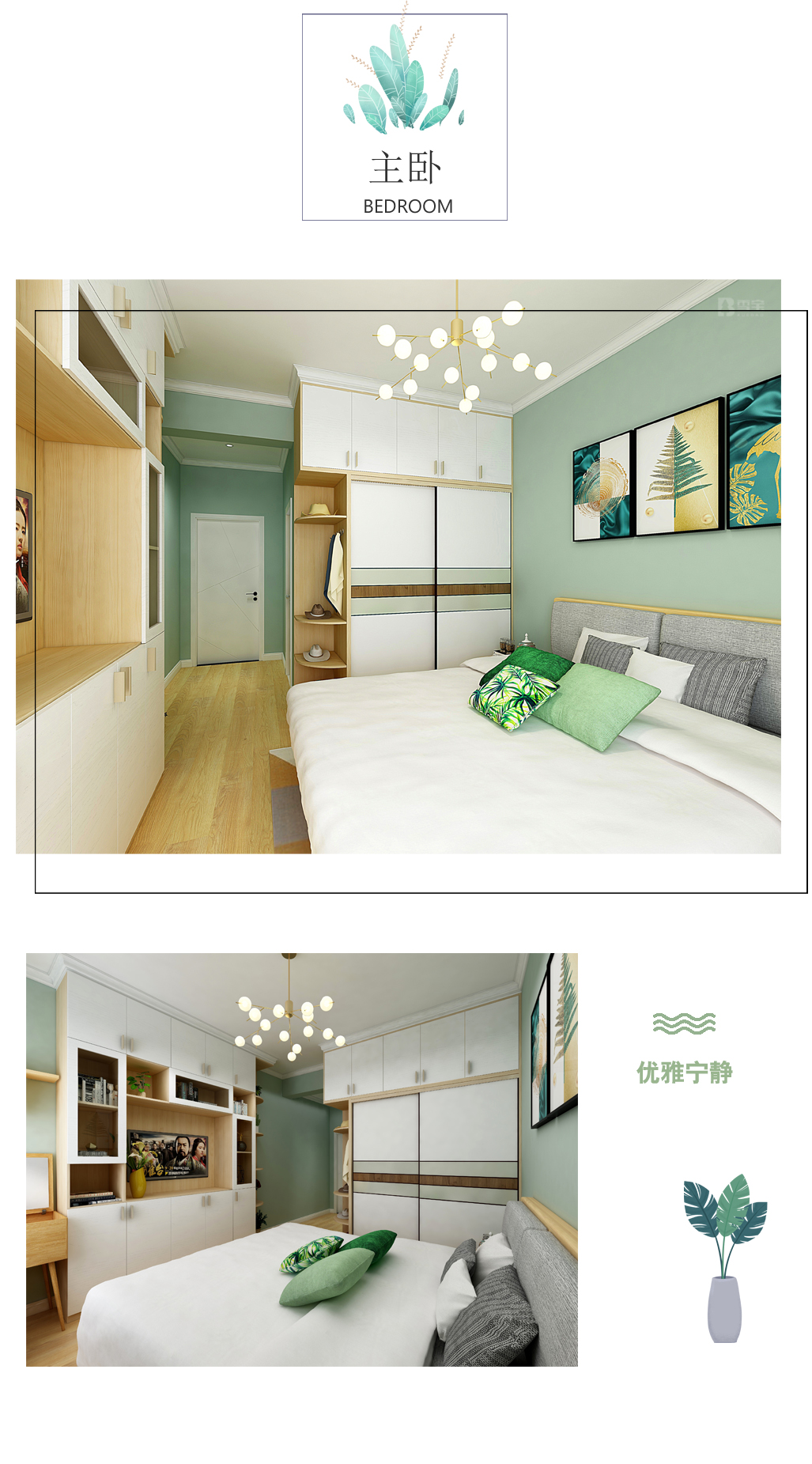 薄荷綠的點綴設計,能為臥室營造一個安靜的休息環境,仿佛能時刻感受到大自然的和煦微風和溫暖陽光,床頭對面白色柜子的設計,既擴大儲存空間,又增添一抹優雅。