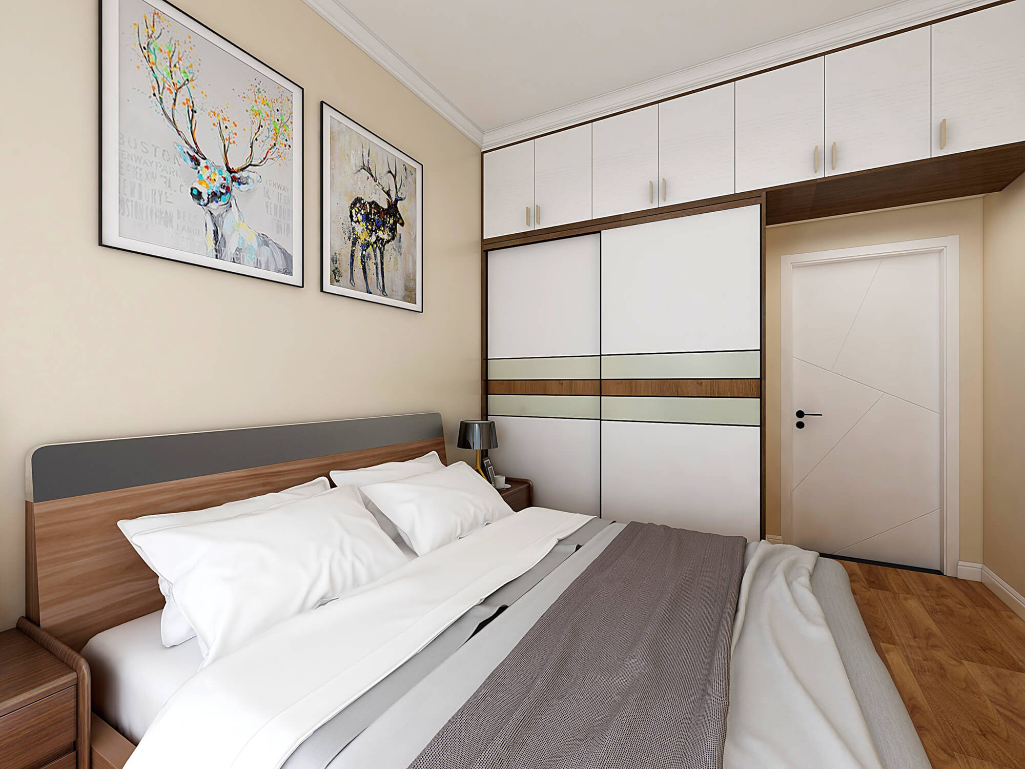 次臥作為父母房使用,老年人經歷了幾十年的人生沉淀,性格和喜好往往更偏于成熟穩重的格調,所以在顏色搭配上面,選擇稍微偏深色一點。