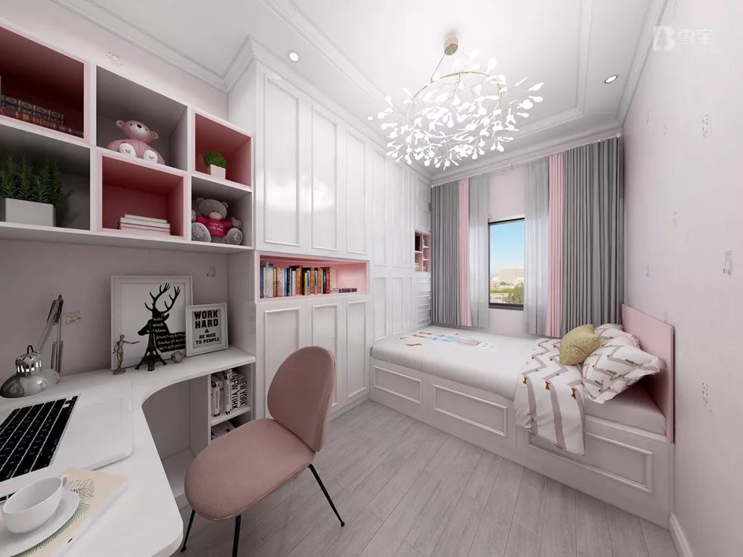 相比男孩房而言,粉色系成為了女兒房的主基調(diào)。柜體搭以雪寶炫彩板粉紅公主花色,以及粉色系軟裝裝飾,空間頓生粉嫩乖巧干凈氣息。小女兒正在逐漸長大,一張收納床與衣柜、書柜書桌組合設計,有效擴大空間實用性。既滿足小女兒日常物品的分區(qū)收納,也實現(xiàn)睡覺、學習、娛樂等多種功能。