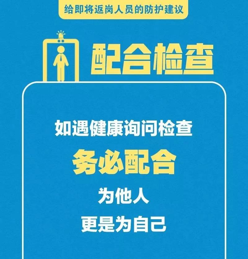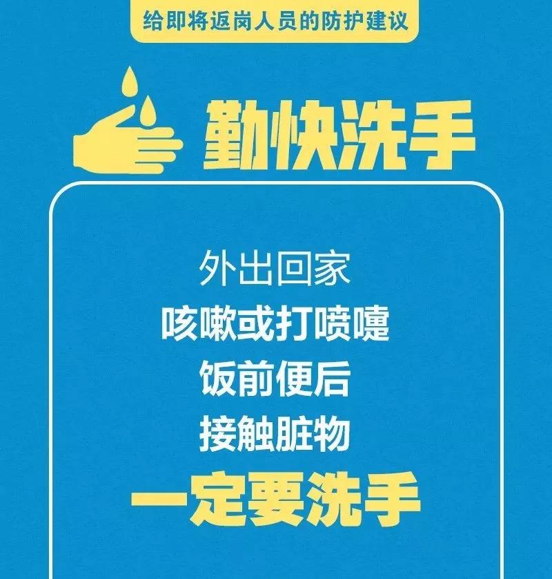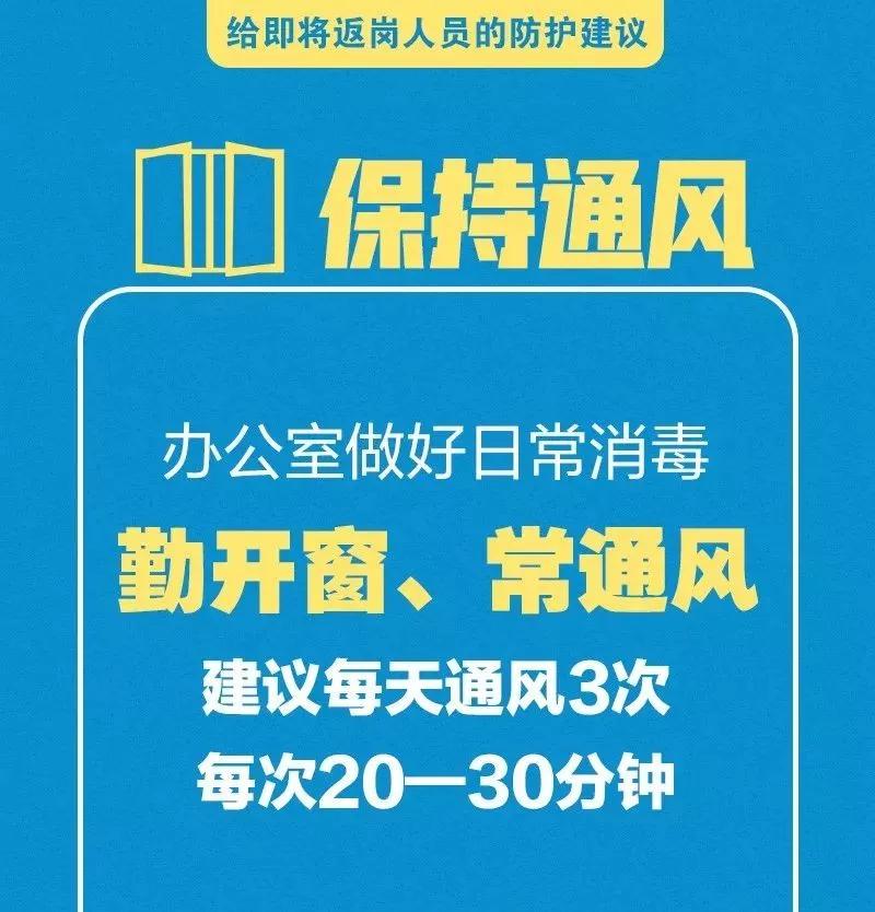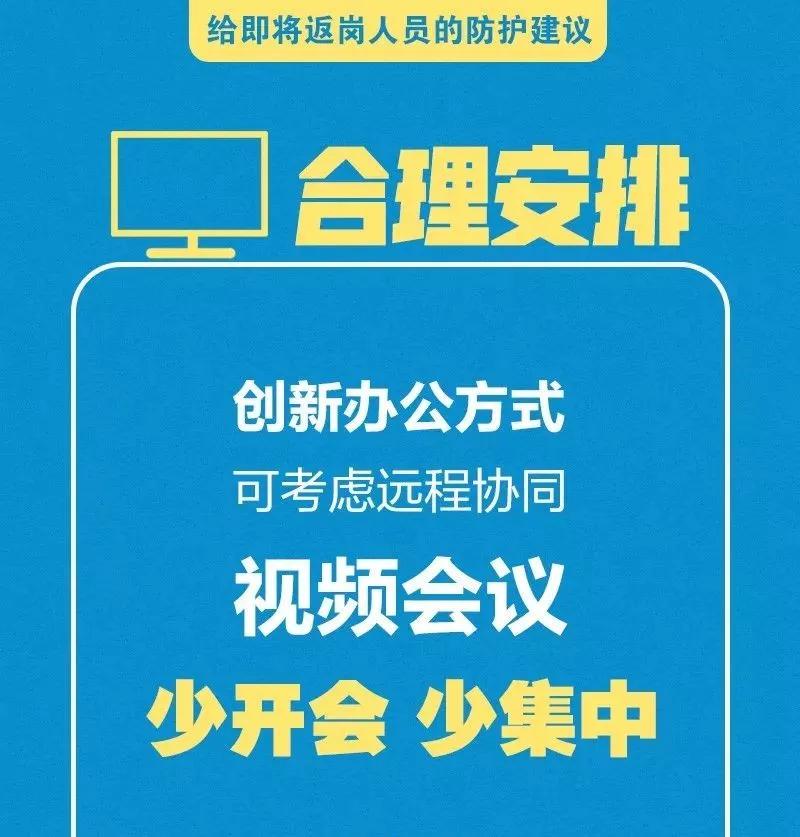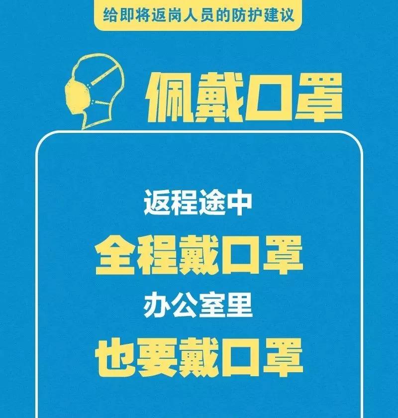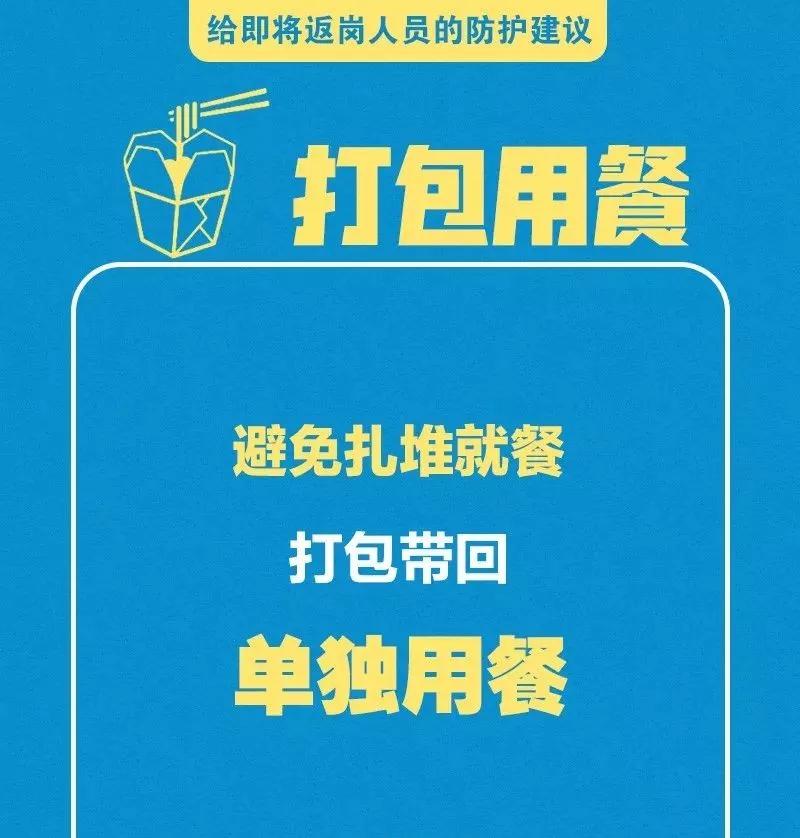 春節(jié)假期已經(jīng)進(jìn)入尾聲,各地政府陸續(xù)出臺復(fù)工延后的政策,但是對于有些人員因一系列原因不得不提前返回工作崗位的您來說,疫情防控仍不能松懈,少開會、少集中,佩戴口罩、打包用餐……這些返崗防護(hù)建議您一定用得著,請牢記!
