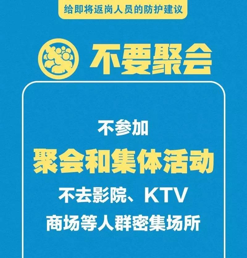 不參加聚會和集體活動!不去電影院、KTV、商場等人群密集場所。返回工作崗位后,出行聽從公司統(tǒng)一規(guī)劃與安排,不去人流量密集場所,減少交叉感染的可能。