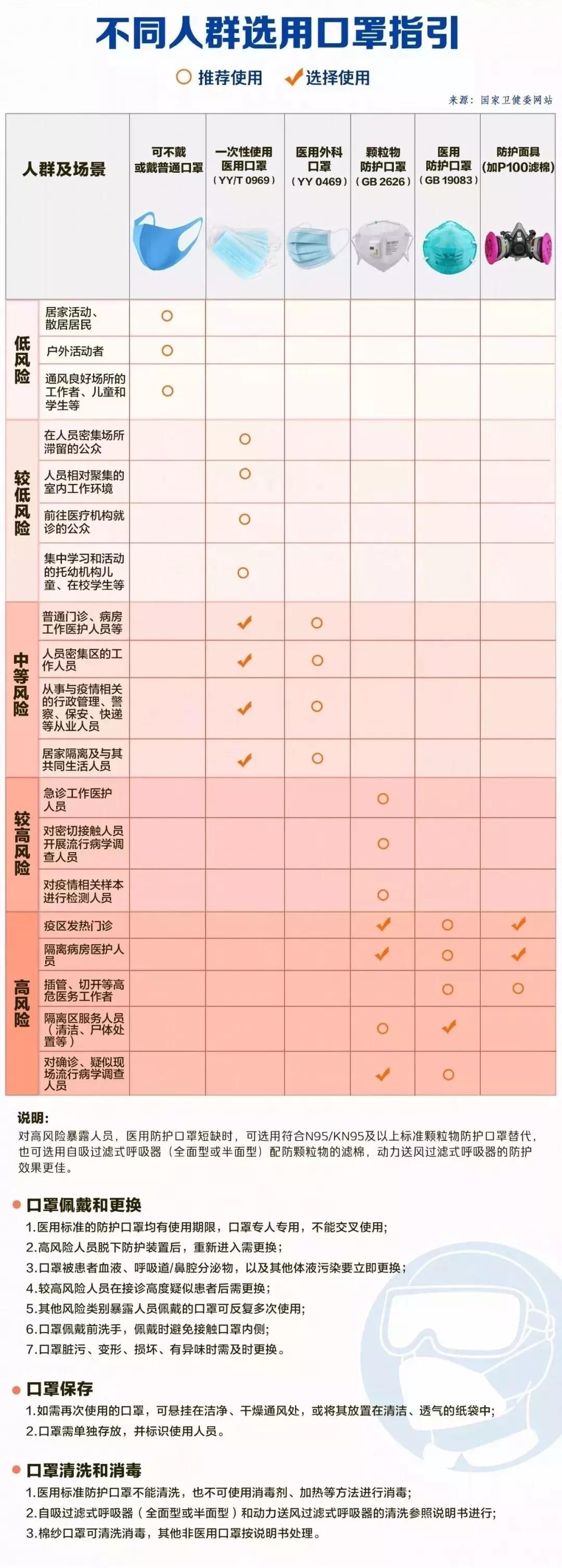 可能很多人會問,我怎么判斷感染風險是高還是低?別急,就在2月5日國家衛健委等權威機構聯合發布了《口罩選擇與使用技術指引》,看看下面這張圖,就知道什么時候該戴,什么時候可以不戴了。畢竟口罩珍貴,且用且珍惜。