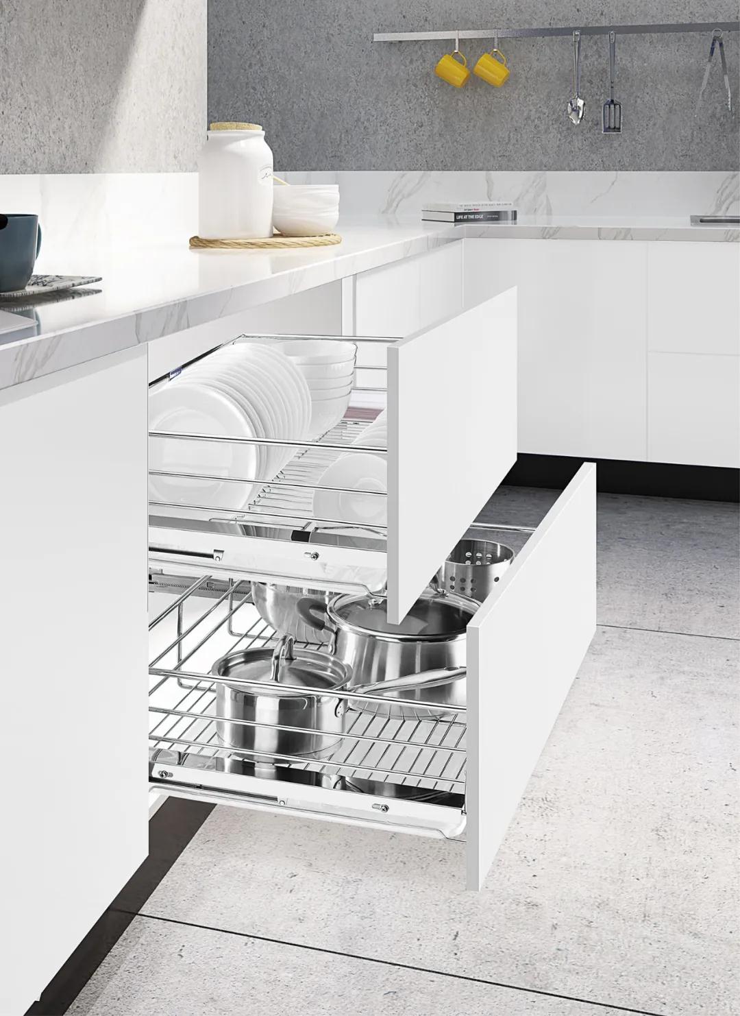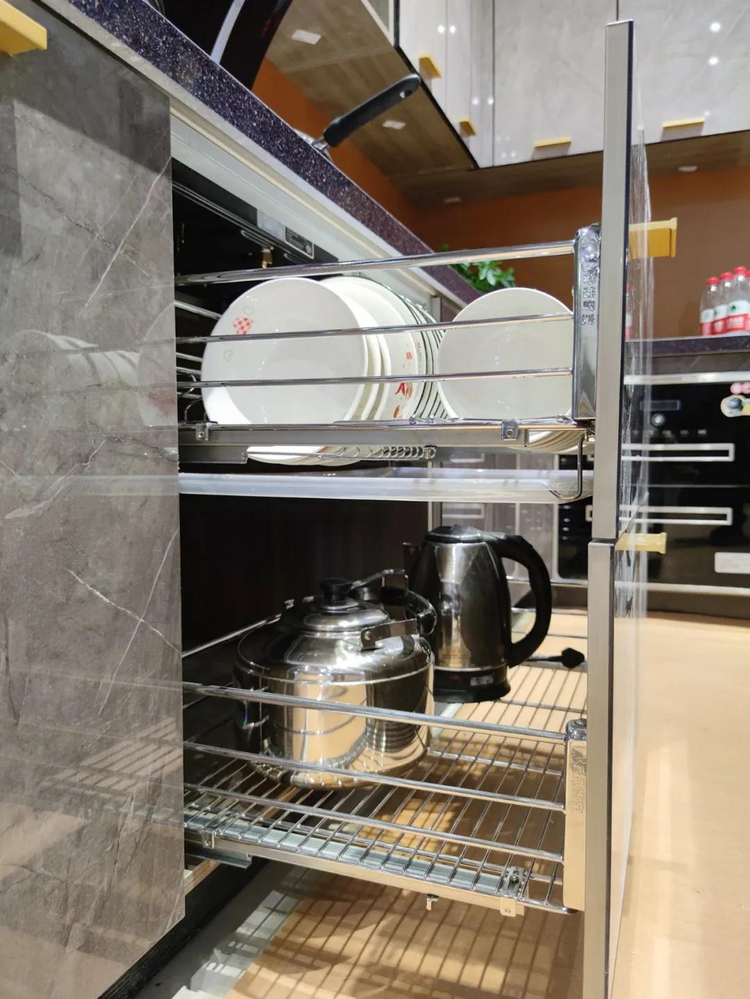 櫥柜拉籃:要說櫥柜的收納,不得不提到拉籃。現(xiàn)代的廚房櫥柜中,拉籃是必不可少的五金件之一。它提供了更多收納的可能,讓廚房更加整潔干凈。有了拉籃,廚房里大大小小的餐具再也不會堆成“慘劇”了。