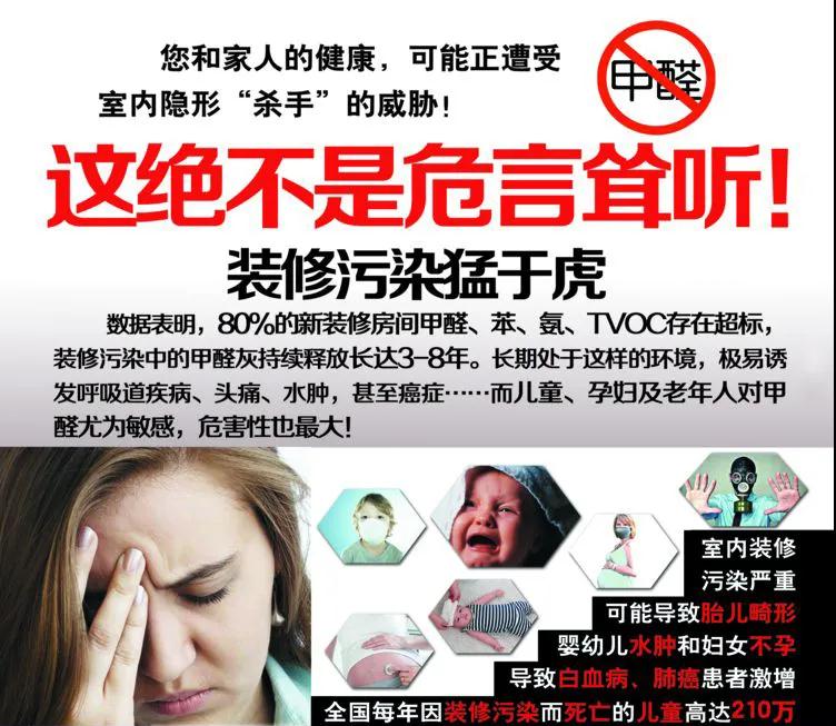 甲醛—:作為一種對人類最有害的氣體,被譽為室內“奪命殺手”,嚴重危害新裝修家庭,尤其是兒童、孕婦、老人的身體健康。