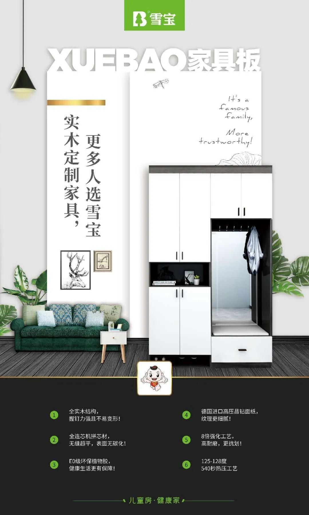 雪寶板材于行業先行創建兒童房健康板的高品質標準。除了選用中大徑原木、植物大豆膠等生態無毒原材料外,雪寶順利通過ISO質量管理體系認證、十環認證,充分表明在產品原料選材、生產環境、生產工藝及品質管理等多方面在行業中領先一步。
