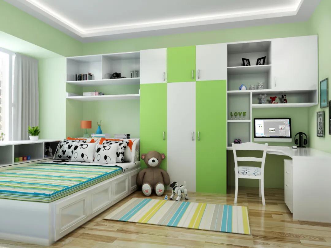 如果不是特別大的房間,推薦采用化零為整的布局思路,把兒童床、衣柜、書桌等家具靠墻擺放,給中間區域更多的空間作為兒童玩耍的地方。