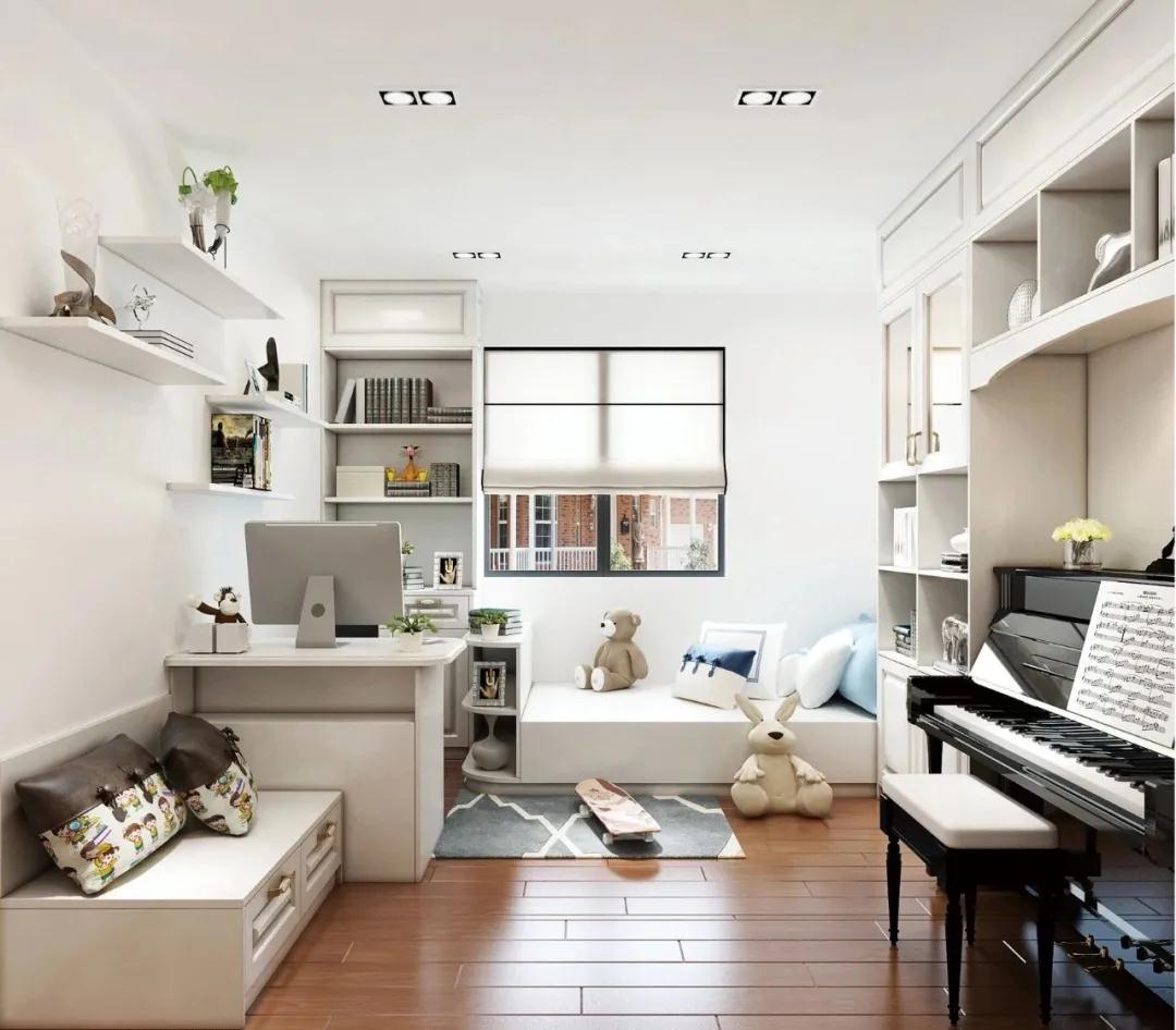 其次,飄窗和書桌連在一起,這種設計節省了空間,更能合理的利用房間的寬度,滿足孩子的學習需求且陽光充足。