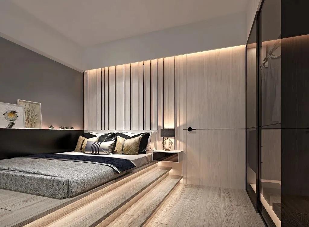 如果臥室不夠寬,可以將床設計成地臺床,另一半用來放拐角式衣柜。