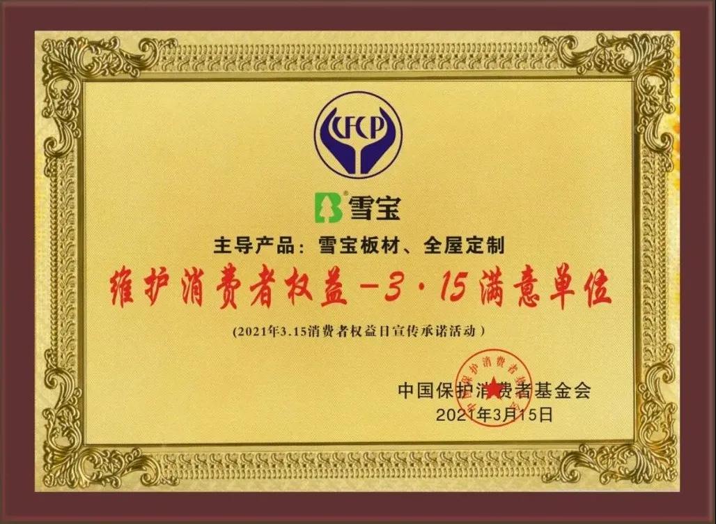作為品牌年度大考,很多企業都避之不及,然而,也有一些品牌根本無懼3·15,他們的產品好評率居高不下,是真正的口碑產品。就在3·15消費者權益保護日這天,雪寶憑借優質的產品、滿意的服務和良好的口碑,品牌主導產品雪寶板材、全屋定制榮獲中國保護消費者基金會授予的【2021“維護消費者權益-3.15滿意單位”】榮譽稱號,表彰其在行業內樹立的誠信經營、重質守信、優質服務等標桿典范!
