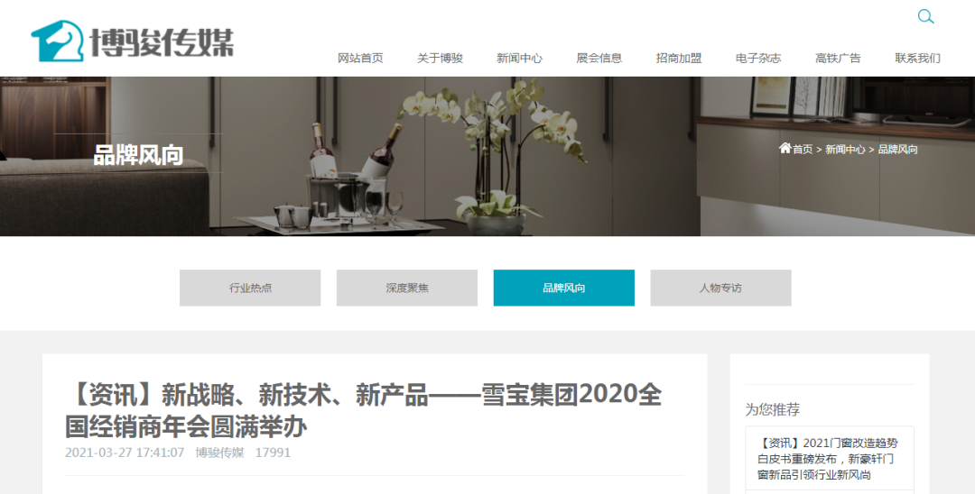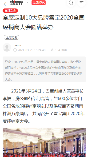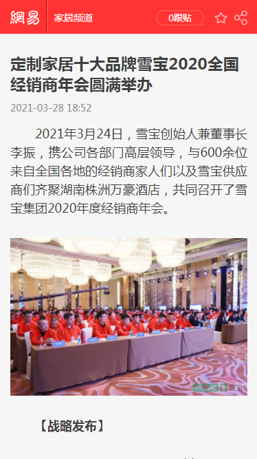 今日頭條、百度、360、新浪家居、搜狐焦點、網易家居、騰訊家居、中國保護消費者基金會、中國質量新聞網、中國木材與木制品流通協會、中國質量萬里行、中國建材網、慧亞網、一兜糖、小紅書、慧聰網、中華衣柜網、央廣網、太平洋家居網、品牌網、齊家、全屋定制網、中國木業網、紅網等等上百家行業主流、權威媒體爭相關注,開啟專題報道,將雪寶2020年度經銷商年會盛典線上曝光度推向高潮。