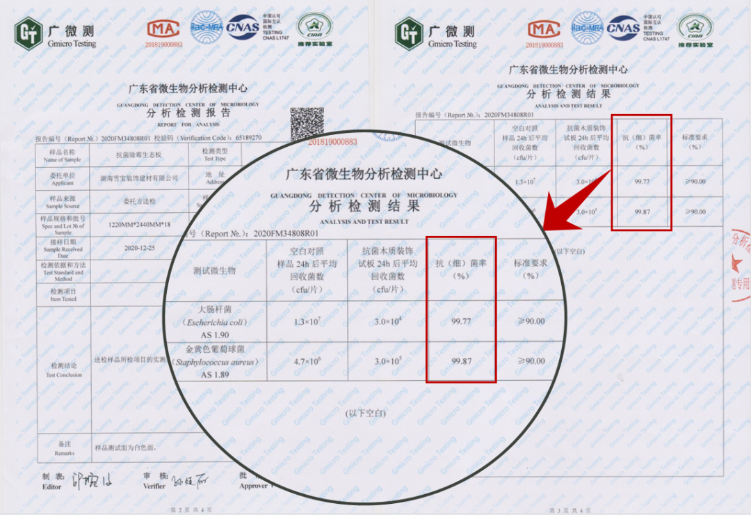 經權威機構檢測,雪寶抗菌防霉板有害細菌有效殺菌率達99%以上;