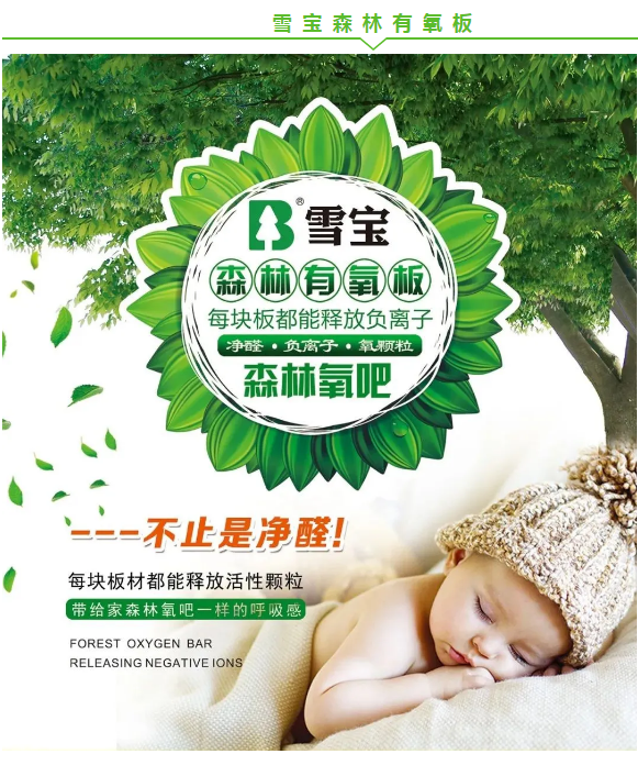 雪寶森林有氧板以環保板材為基礎,在裝飾表面特別添加長效“負氧離子”的環保板材,所產生的“負氧離子”,有效改善空氣中游離的有害物質,并可將甲醛分解為水分子與無毒無害的“肟”,實現清除室內甲醛、凈化空氣的效果!