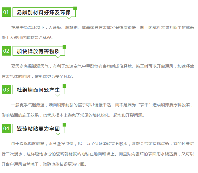 言歸正傳,其實在任何季節,裝修都會面臨大大小小的問題。只要處理好應注意的事項,夏季裝修也有諸多好處喲~