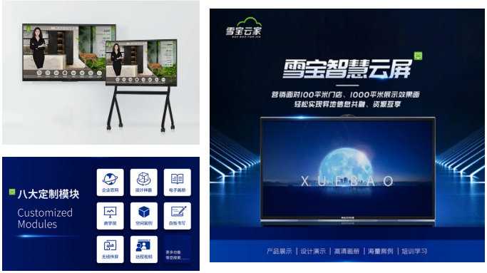 雪寶智慧云屏是一款集企業展示、設計下單、內訓學習、遠程互通等多功能于一體的高清智能多媒體一體機,有助于門店多維智能展示,打通總部與終端門店的點對點溝通,提升門店經營效率。