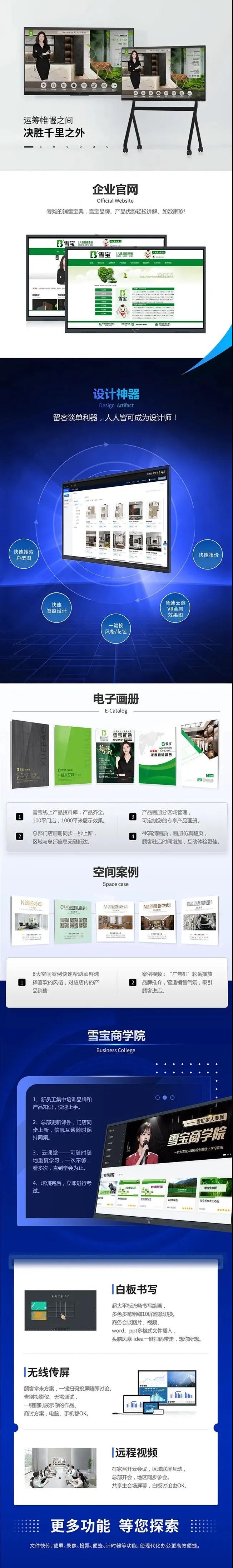 如今有了雪寶智慧云屏的門店,不僅能在有限的實體空間中展示無限的產品,還能讓消費者從“被動挑選產品”變為能夠主動去參與、體驗和互動,真正實現全方位面提升顧客入店體驗。另外除了“全景圖”功能以外,雪寶智慧云屏還有其他功能為全國各門店賦能,提高門店銷售業績: