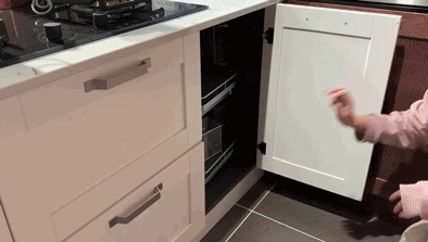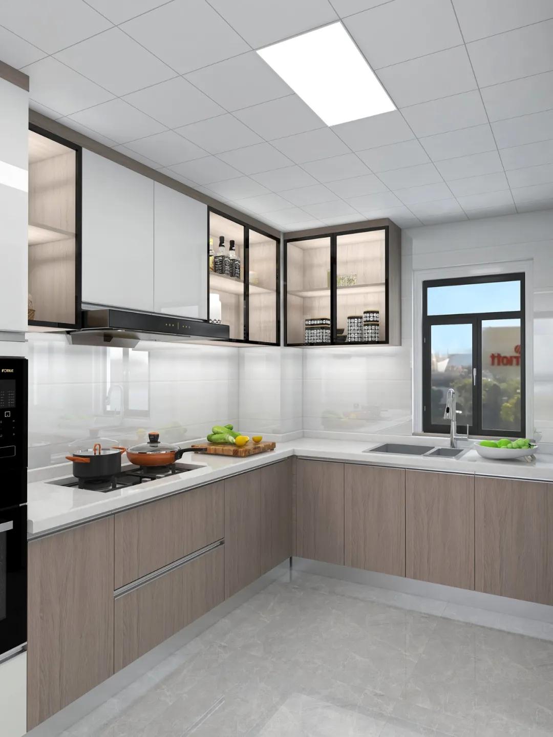 L型不僅合理設計“洗切炒”三大功能區,還能讓廚房動線更順暢。能將轉角柜的雞肋空間充分利用起來,在轉角柜處設計開放式擱架、轉角拉籃等,拿取各類廚房用品超方便。