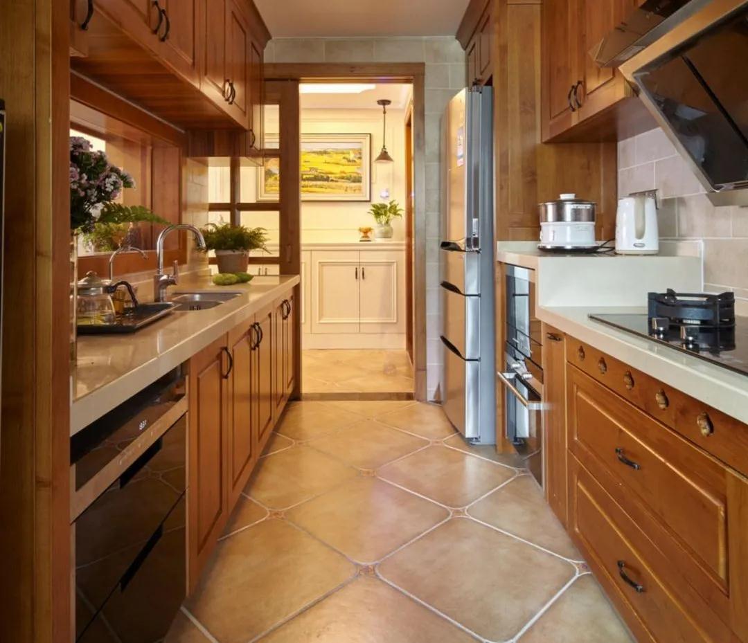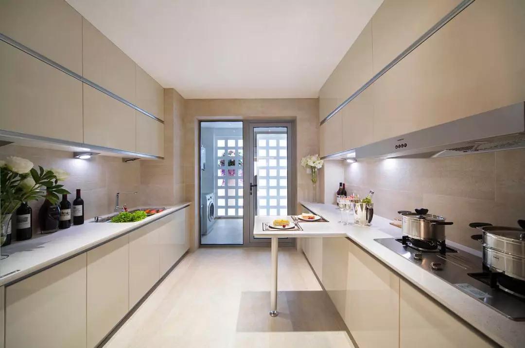 也叫雙一字型廚房,是最高效的廚房布局,最大化分配廚具和操作臺的空間,廚房長而窄,兩側都有空間,在走廊一側空間足夠的話,還可以設計一個溫馨小餐廳。