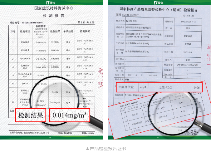高品質標準的雪寶,論選材、工藝、品質、服務、口碑等諸多方面都有著絕對優勢和傲人成績,多年前就已成功研發生產出企業標準無醛級板材,甲醛釋放量≤0.014mg/m³,也就是說,這個數據優于新國標ENF級(≤0.025mg/m³)!