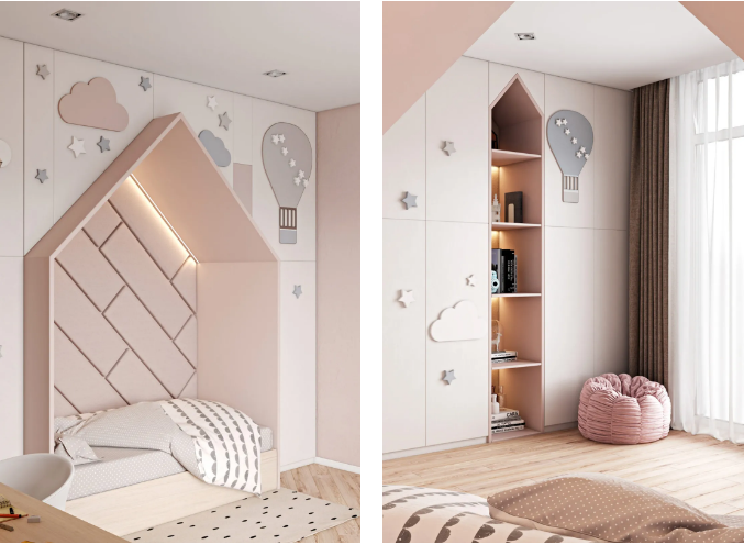 設計兒童房的時候,可以選擇衣柜、儲物柜、書桌、榻榻米結合的一體式設計,房間形成一個整體,節約空間之余還能做好房間分區。