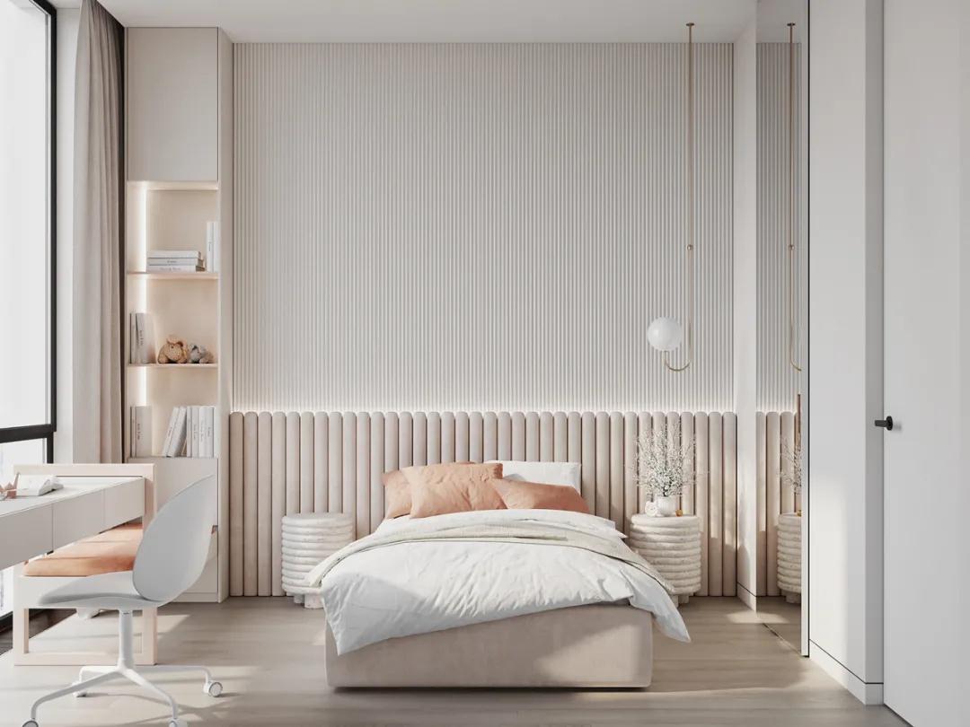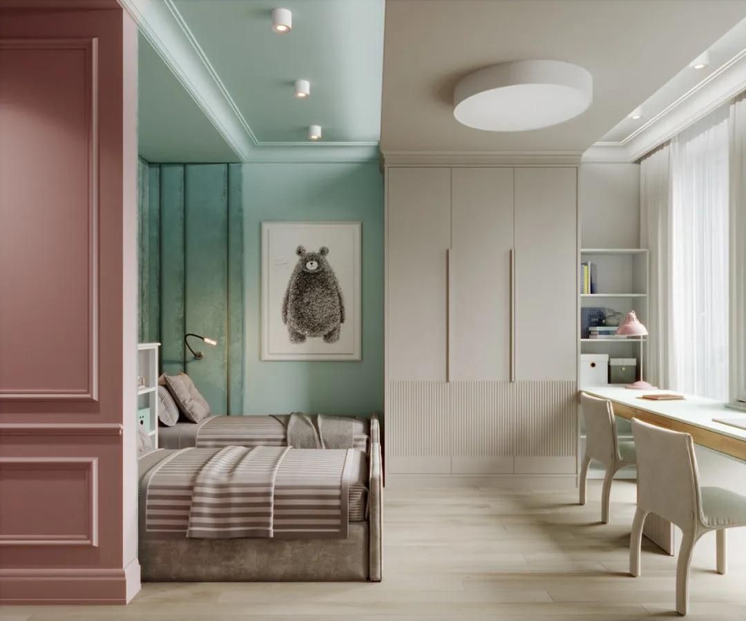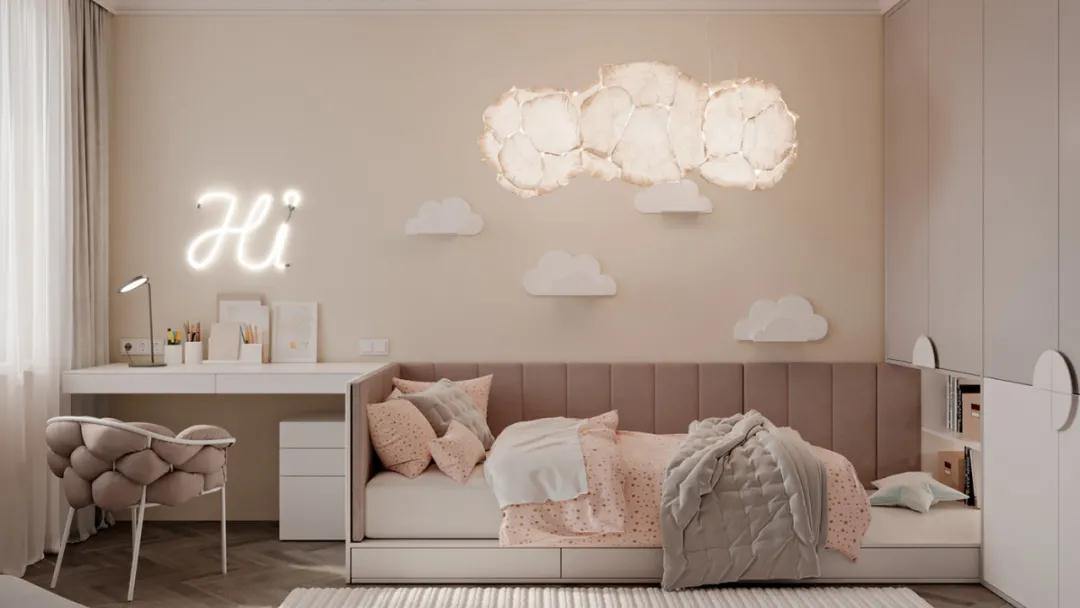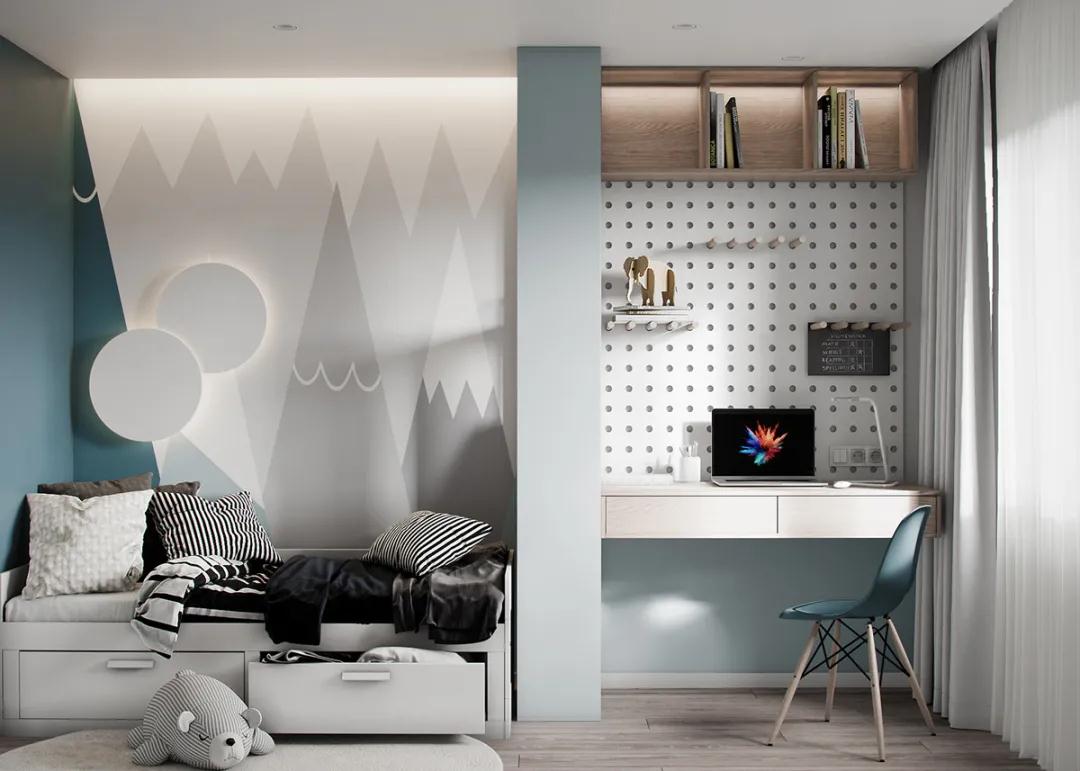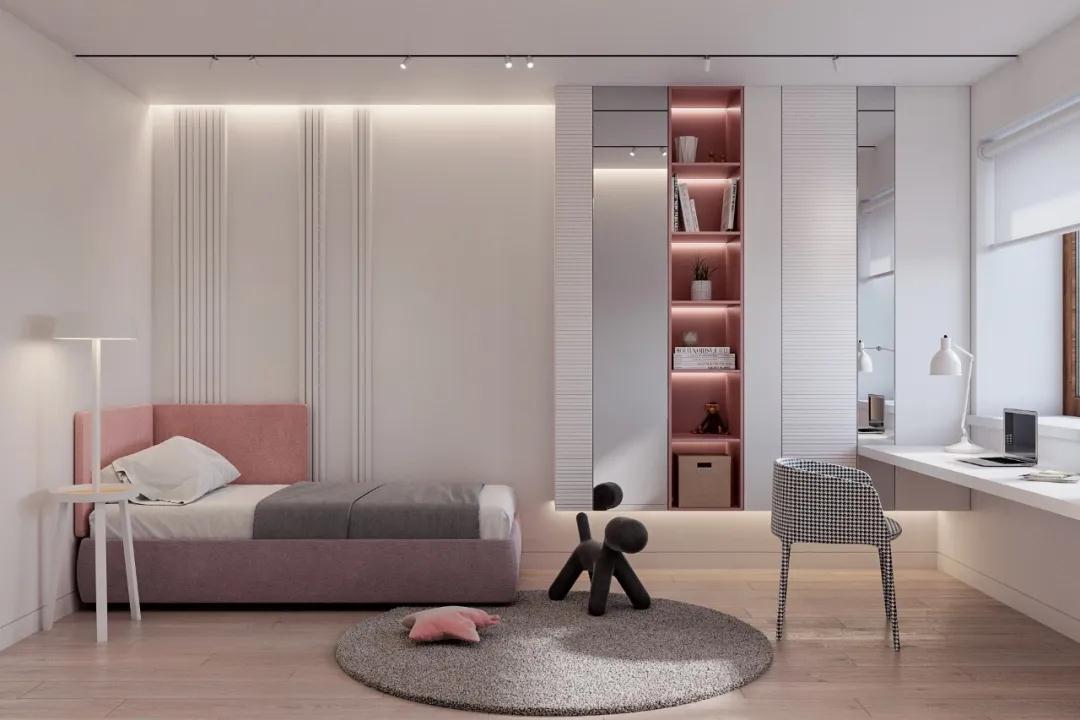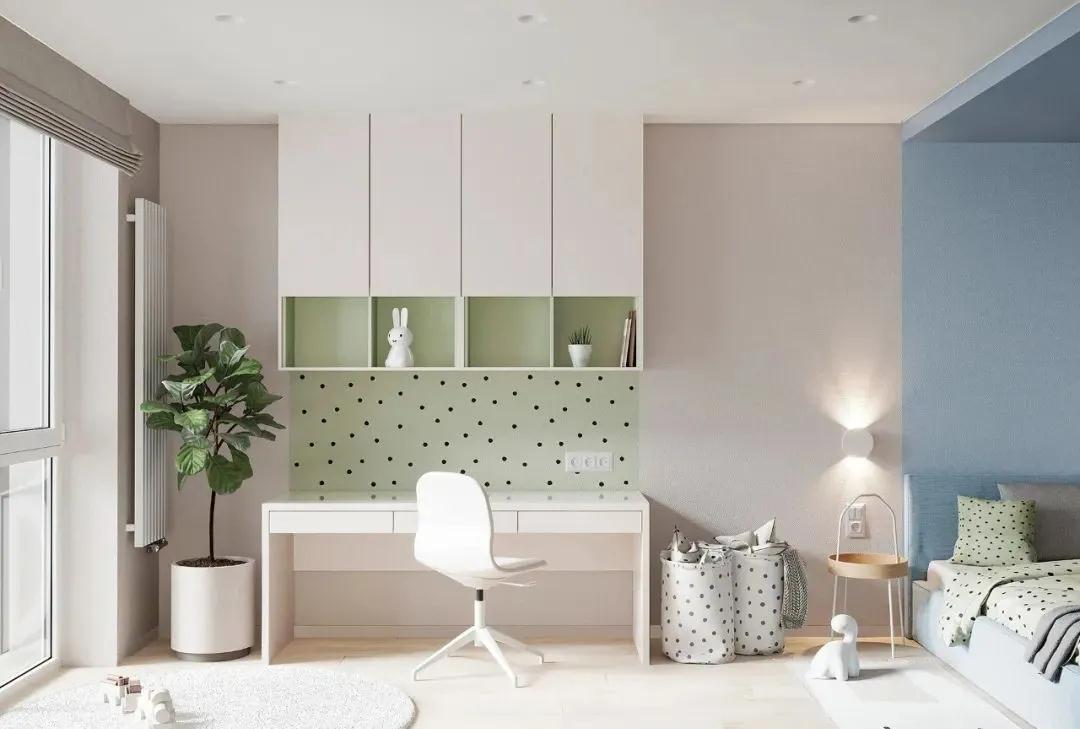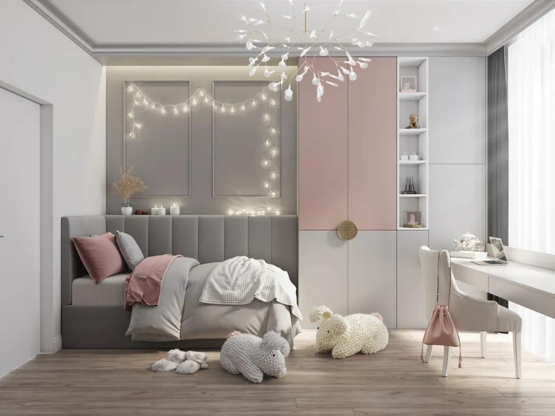 兒童房的背景色宜選擇淺色,如白色、淺灰色、原木色等百搭色。主體色的作用是突出空間重心,兒童房的主體色宜選用原木色、高級灰以及低飽和度的亮色,如藍色、黃色、粉色等。更多的“童趣”可以體現在兒童房的點綴色上,如床品、窗簾、抱枕、玩具、掛畫等軟裝飾品。