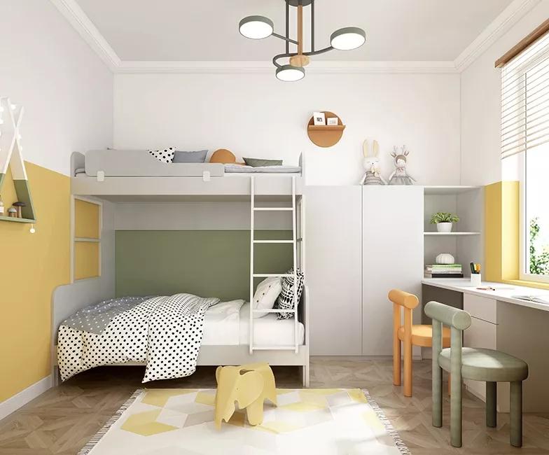 隨著國家持續開放二胎和三胎,上下床的設計自然是必不可少,上下床提高空間利用率。書桌+儲物柜+上下床一體創意設計,以睡床為中心,巧妙地將儲物柜、擱板以及書桌環繞其周圍,簡約大方的布局,提升了空間格調,增加了更多娛樂空間。