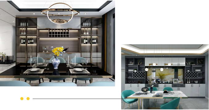 隨著現(xiàn)代生活理念的變化,輕奢元素進(jìn)入更多年輕一代的生活,能更好的襯托出餐廳的格調(diào)。定制餐邊柜將墻面最大程度地利用,一柜到頂,合理劃分區(qū)域,做到餐具收納+展示柜+酒柜的多功能結(jié)合,是最佳的呈現(xiàn)。