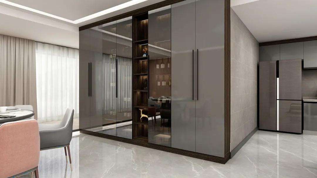 玻璃材質(zhì)展示出夢(mèng)幻、晶瑩的效果,配合柔和的輔助燈光,更添氛圍感,輕奢氣質(zhì)呼之欲出。結(jié)合主人的喜好,擺放上收藏品、紅酒、綠植、畫作,讓用餐區(qū)域增添情調(diào),倍添姿色。