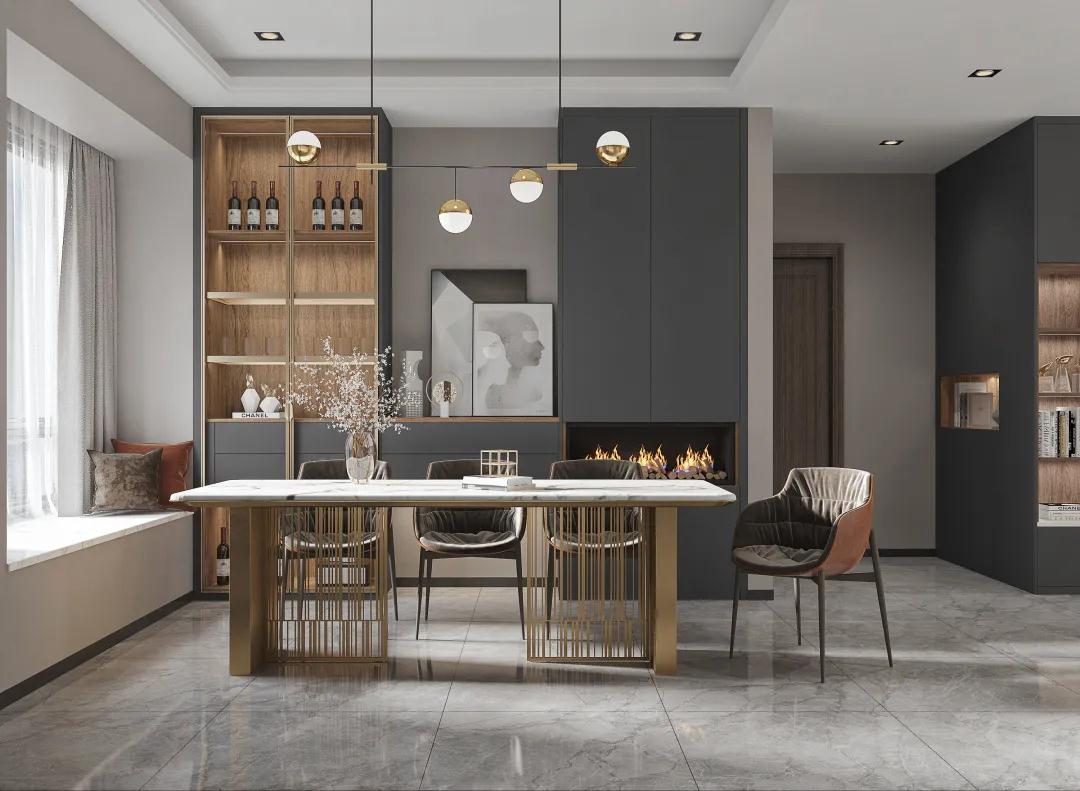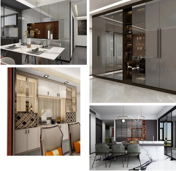 顏色上可選淺色系,帶來更開闊的視覺感受。或者選擇與周圍軟裝相近的深色系,配合精致的燈具造型。或在餐邊柜局部運用出挑的顏色,制造視覺上的反差效果,強調存在,帶來鮮明的觀感。