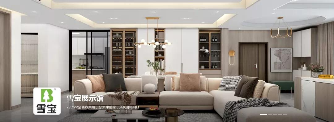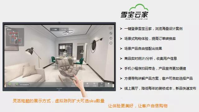 通過雪寶智慧云屏,客戶只需一鍵切換,輕輕用指尖滑動,即可隨心切換不同花色、風格和產品效果圖,以沉浸式、可視化的方式呈現720°VR全景漫游,提升顧客體驗感和代入感。