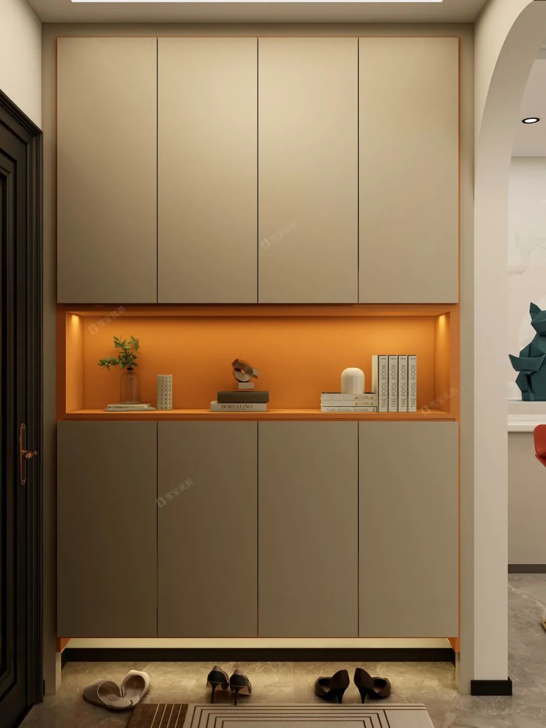 鞋柜內(nèi)部配以裝飾燈帶點(diǎn)綴,免除了回家摸黑找開(kāi)關(guān)的煩惱,還能讓人一進(jìn)門就感受到家的溫暖。