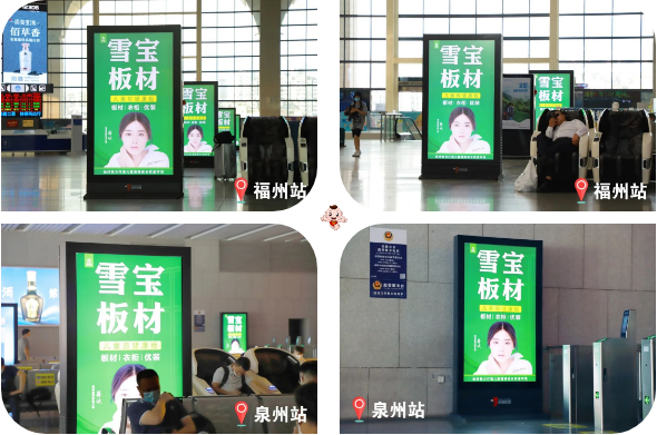 高鐵以“國家新名片”的國家高度為品牌傳播背書,為品牌形象帶來無以倫比的附加值,是品牌傳播的制高點,具有不可替代性,唯一性,排他性,傳播到達率 100%。雪寶板材以強勢之姿打出華南區域高鐵站群廣告沖擊波,代表行業品牌高端形象,讓品牌直接觸達目標人群,實現品牌強有力的曝光。