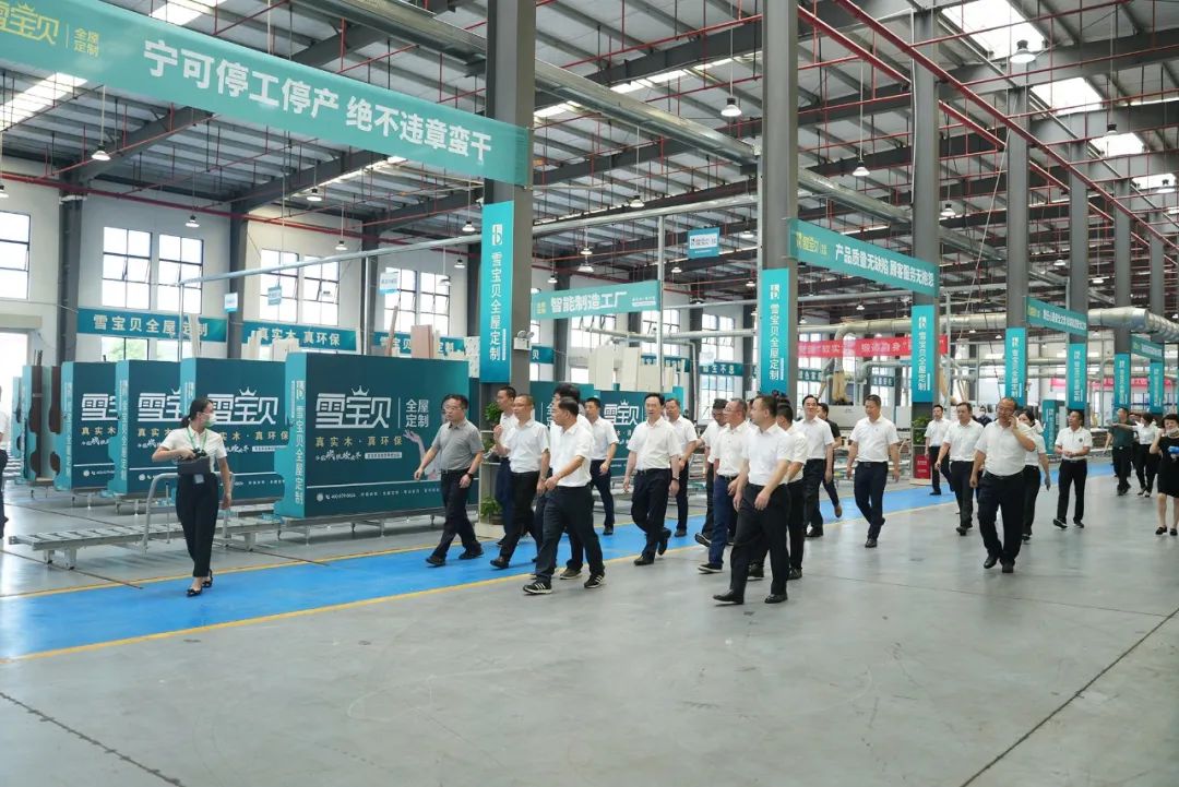 在雪寶現代化工廠觀摩中,市區領導一行通過儀器檢測體驗了能釋放負離子的森林有氧板,了解了雪寶智能制造加工生產的標準作業工作流程,并且就如何把板材精準無誤變成板件,最后成為家具柜的工藝全流程聽取了匯報講解。