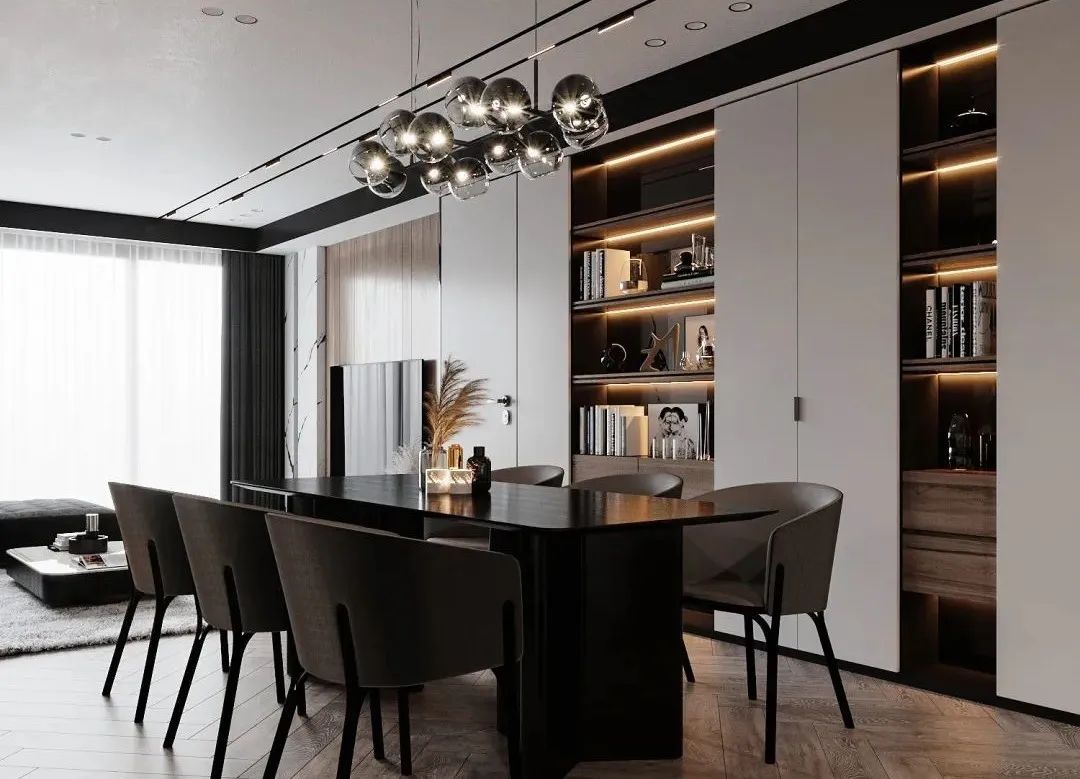 超高柜門常用于玄關入戶區域的鞋柜,餐廳的餐邊柜,客廳電視背景墻的收納柜,臥室衣帽間的衣柜和廚房櫥柜,陽臺的收納柜都可以采用超高柜門的形式,根據每個空間的特性需求,來合理的配置柜體內部的收納區域。