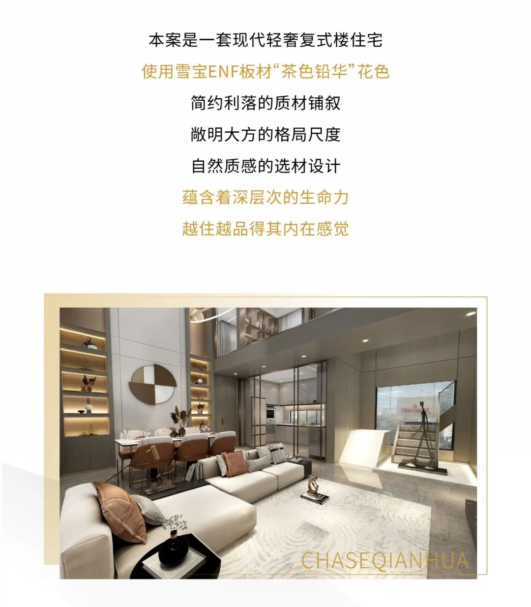 雪寶ENF級(jí)板材“茶色鉛華”,現(xiàn)代輕奢復(fù)式樓,優(yōu)雅時(shí)尚質(zhì)感