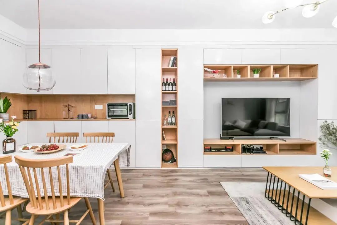 電視柜+餐邊柜整墻定制,這種設(shè)計適用于一體式的客餐廳,不僅能提升客餐廳的儲物能力,還能拉長客廳視覺,讓小空間更顯大。