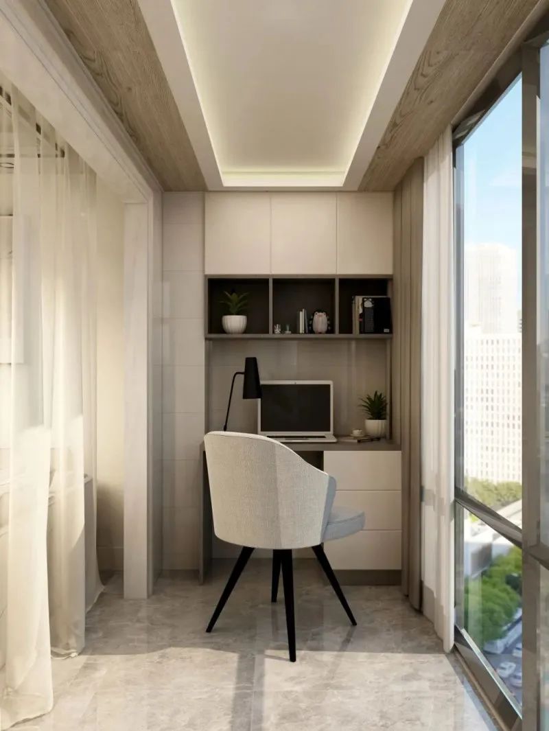 陽臺柜設(shè)計得好,可以為陽臺增色不少。陽臺上部分做到頂半開放式吊柜,用來收納和展示。下方做書桌臺面,就能成為一個獨立的辦公區(qū)。陽臺視野寬闊,工作閑暇舉目遠眺,還可放松身心。