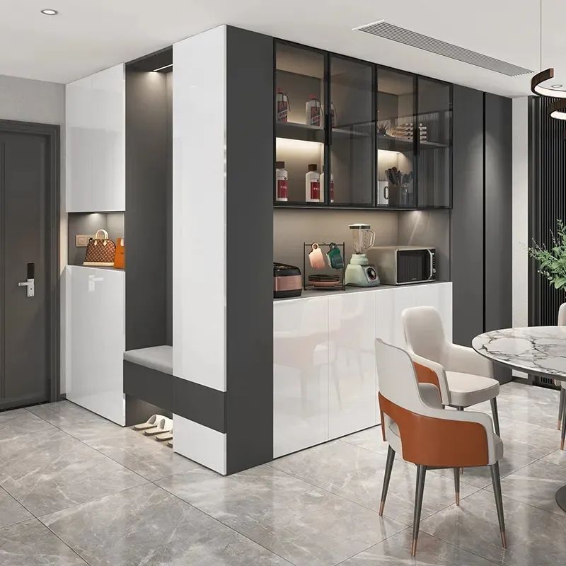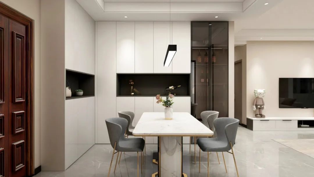 入戶和餐廳連在一起的戶型可以試試在入戶處打造“L型”入戶餐邊一體柜,以轉(zhuǎn)角區(qū)分二者功能,在不浪費每一平米墻面的同時,風(fēng)格又和諧統(tǒng)一,避免了柜體配色困擾。