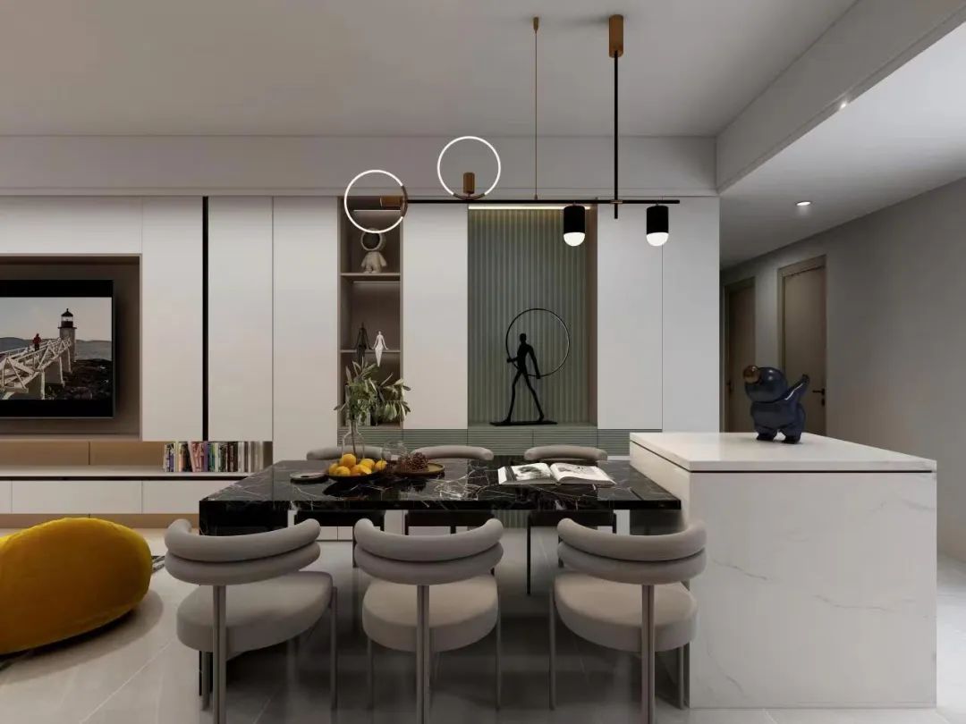 如果覺得客餐廳沒有隔斷,空間區(qū)域劃分不明顯的話,還可以在電視柜與餐邊柜中間設(shè)計整列開放格或其它方式作為視覺觀感上的區(qū)隔。
