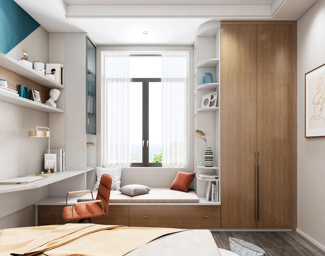 靠窗定制飄窗柜,擴大儲物空間,上鋪軟墊,可以坐躺在上面休息,放松身心;靠飄窗柜定制書柜和書桌,又成為了一個學(xué)習(xí)辦公區(qū),沒有獨立書房的家庭,就能把這里當(dāng)開放式書房了哦~