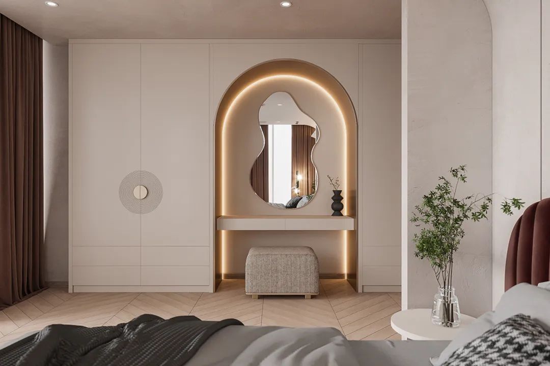 臥室定制到頂式衣柜,大氣簡約,儲物豐富。在轉(zhuǎn)角凹位處延展出同色系梳妝臺,一體化設(shè)計充分利用了轉(zhuǎn)角空間,在風(fēng)格上看也比單獨買梳妝臺更和諧統(tǒng)一。