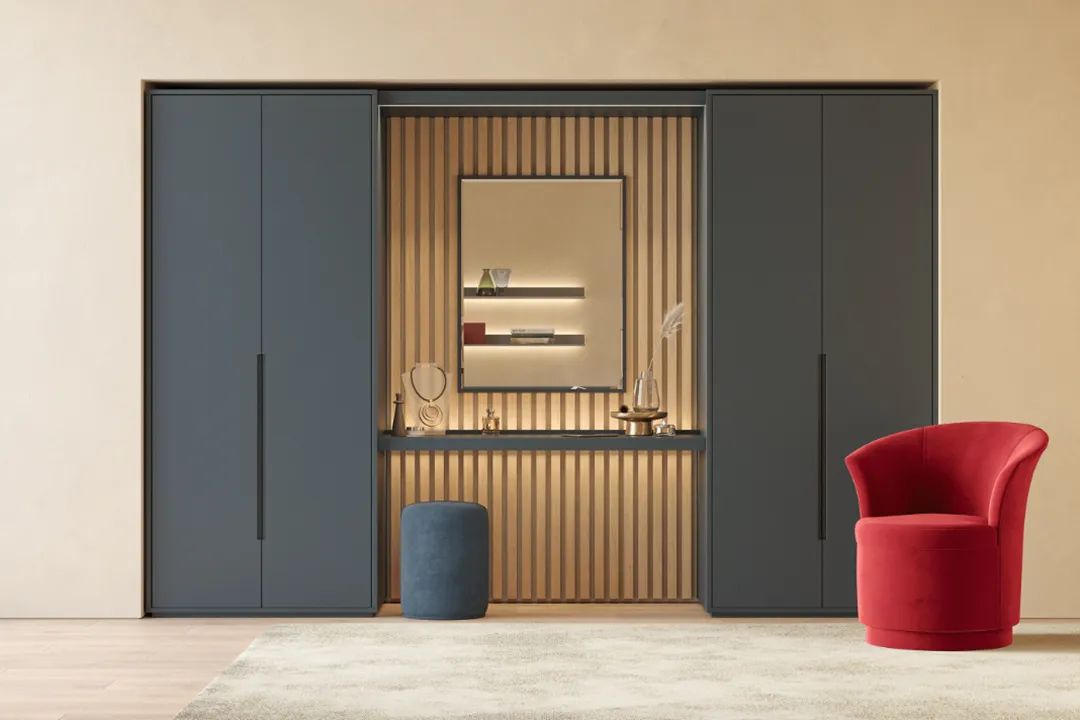 當(dāng)然,除了延展出來,也可以直接把梳妝臺“裝”在衣柜里,做衣柜時提前設(shè)計好在某一處空出一個空間,定制一個置物格,安裝抽屜,充當(dāng)梳妝臺面,不僅整體性強,也更節(jié)省空間。