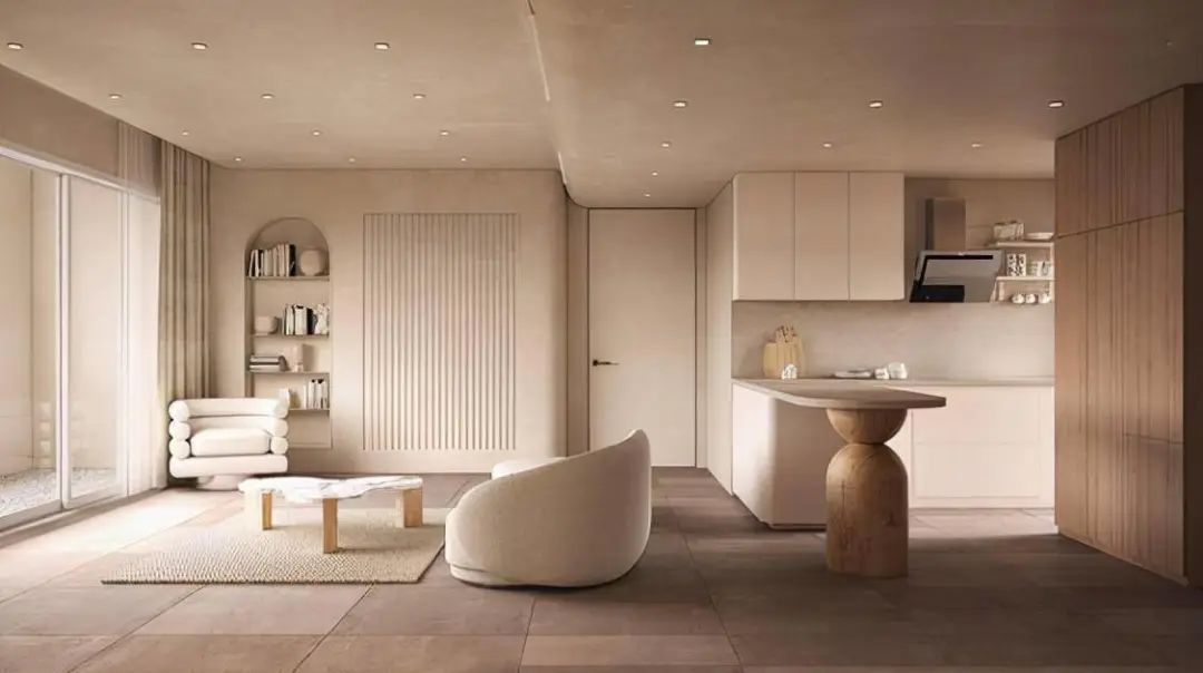 侘寂風的設計,沒有復雜的裝飾、圖案花紋,墻頂地的整體造型盡量簡潔大方。