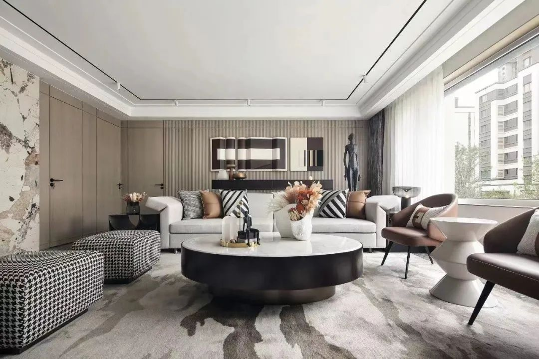 保持客廳整潔的絕佳辦法就是把一切瑣碎都收到眼睛看不到的地方。在客廳中做門墻柜一體化是非常流行的設計,可沿著過道墻、電視墻或者沙發(fā)墻定制多功能組合柜,讓單一空間具備多重功能,呈現(xiàn)大氣簡約的空間感。